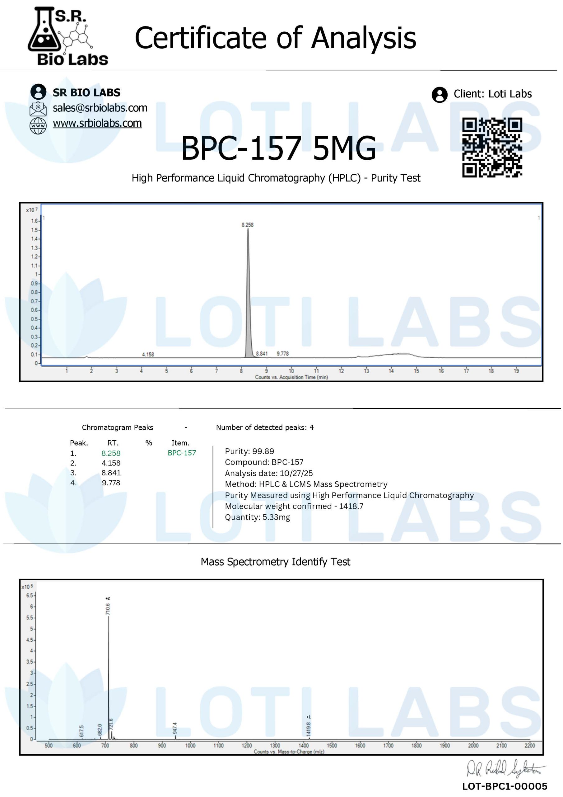 Every batch of products sold by Loti Labs is tested by a third-party using HPLC to ensure product purity and accuracy. The certification process includes mass spectrometry analysis to confirm the exact amino acid sequence of BPC-157.