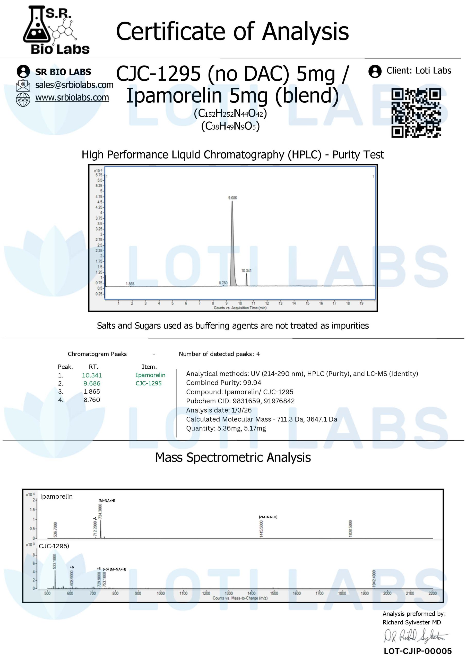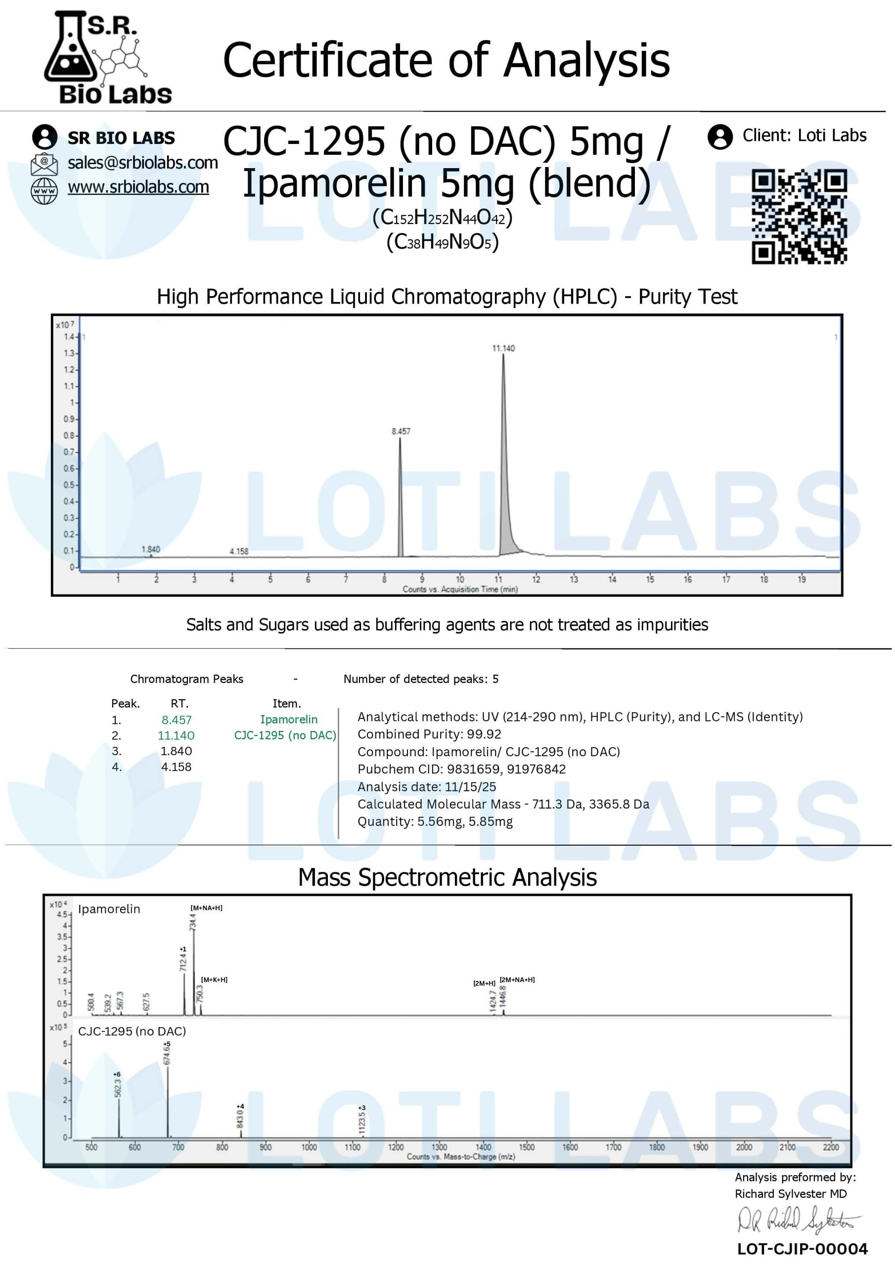 Loti Labs provides CJC-1295 and Ipamorelin blend peptides with verified purity above 98%, as tested by independent analytical methods. This purity level ensures minimal contaminants that could introduce variables into your experiment or affect growth hormone release.### **Packaging and Storage