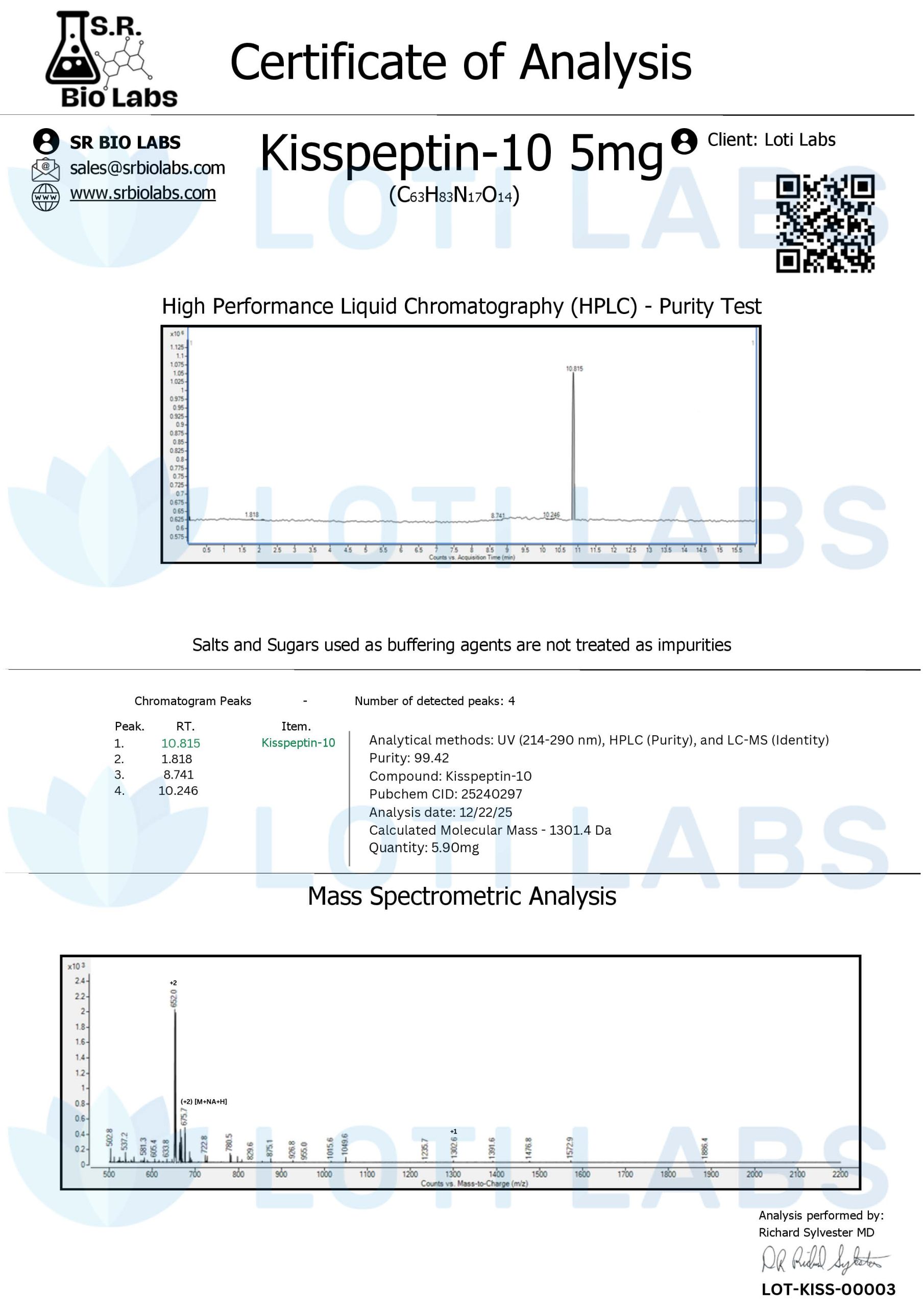 Every product sold by Loti Labs is third party tested using HPLC to ensure product purity and accuracy. Certificate of Analysis is included with each order, verifying the ≥95% purity standard for research grade Kisspeptin 10.