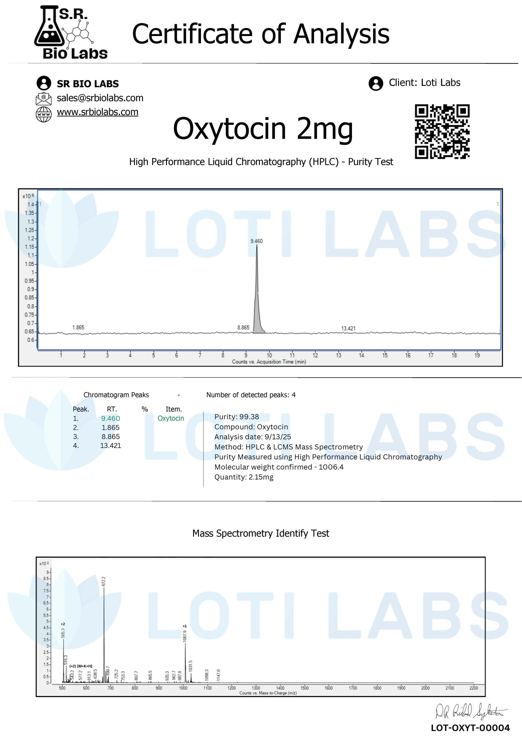 Loti Labs offers oxytocin with greater than 99% purity, accompanied by a certificate of analysis for each product lot. This level of purity allows researchers to verify the quality of their materials and get reproducible results across different studies and labs.