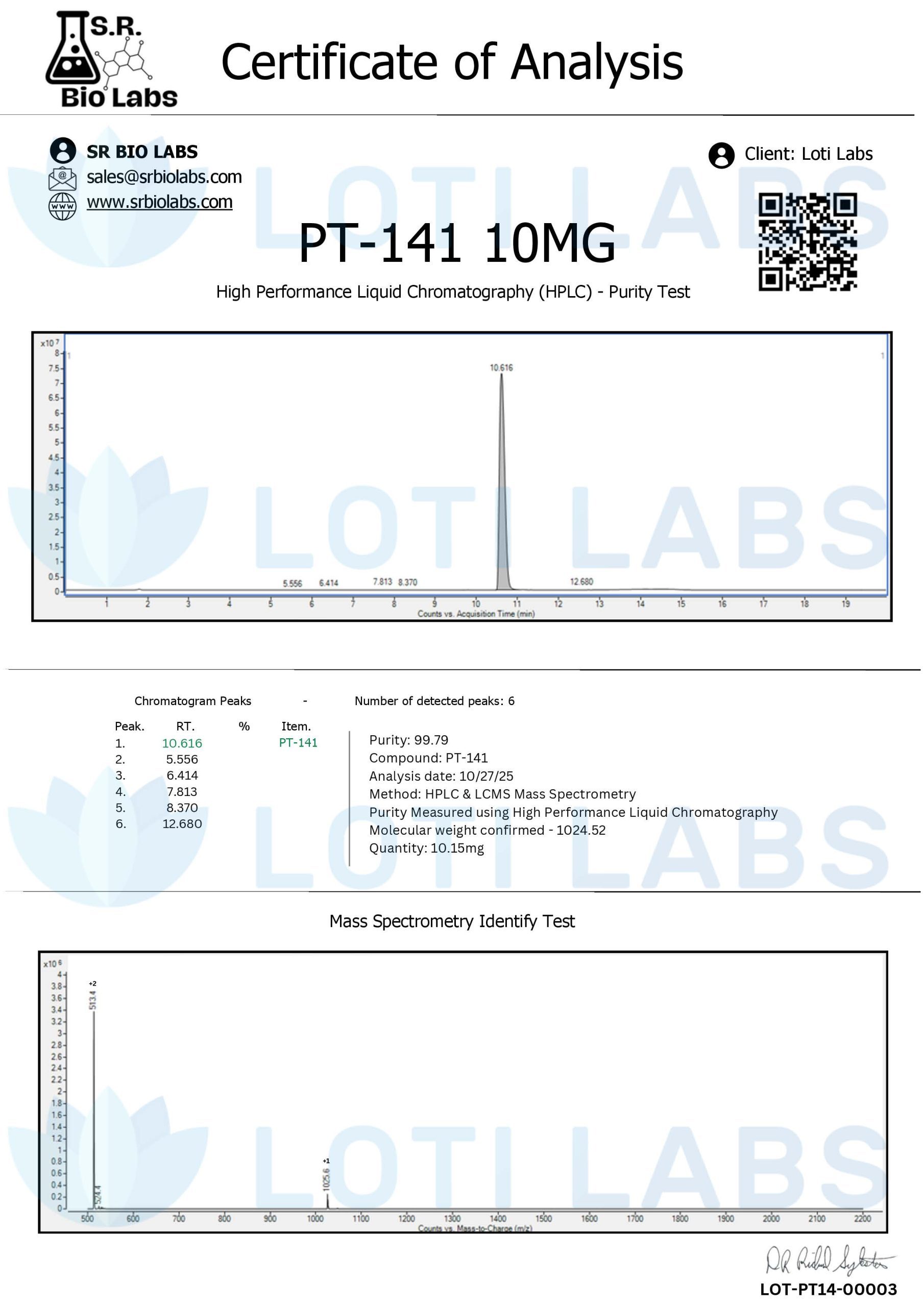 Every batch of PT-141 is tested by third party using HPLC analysis to verify purity, potency and sterility. This independent verification gives researchers confidence in the product they receive and ensures experimental results reflect true compound activity and not quality variations.