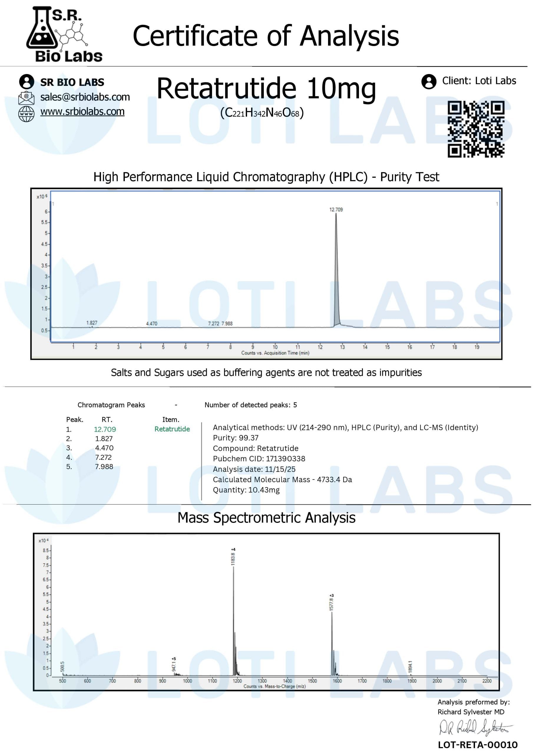 Each batch of Reta from Loti Labs comes with comprehensive Certificate of Analysis documentation. This batch-specific testing data is important for researchers who need detailed compound characterization for their research. The documentation includes purity verification, identity confirmation and relevant analytical data that researchers need for experimental planning and regulatory compliance.
