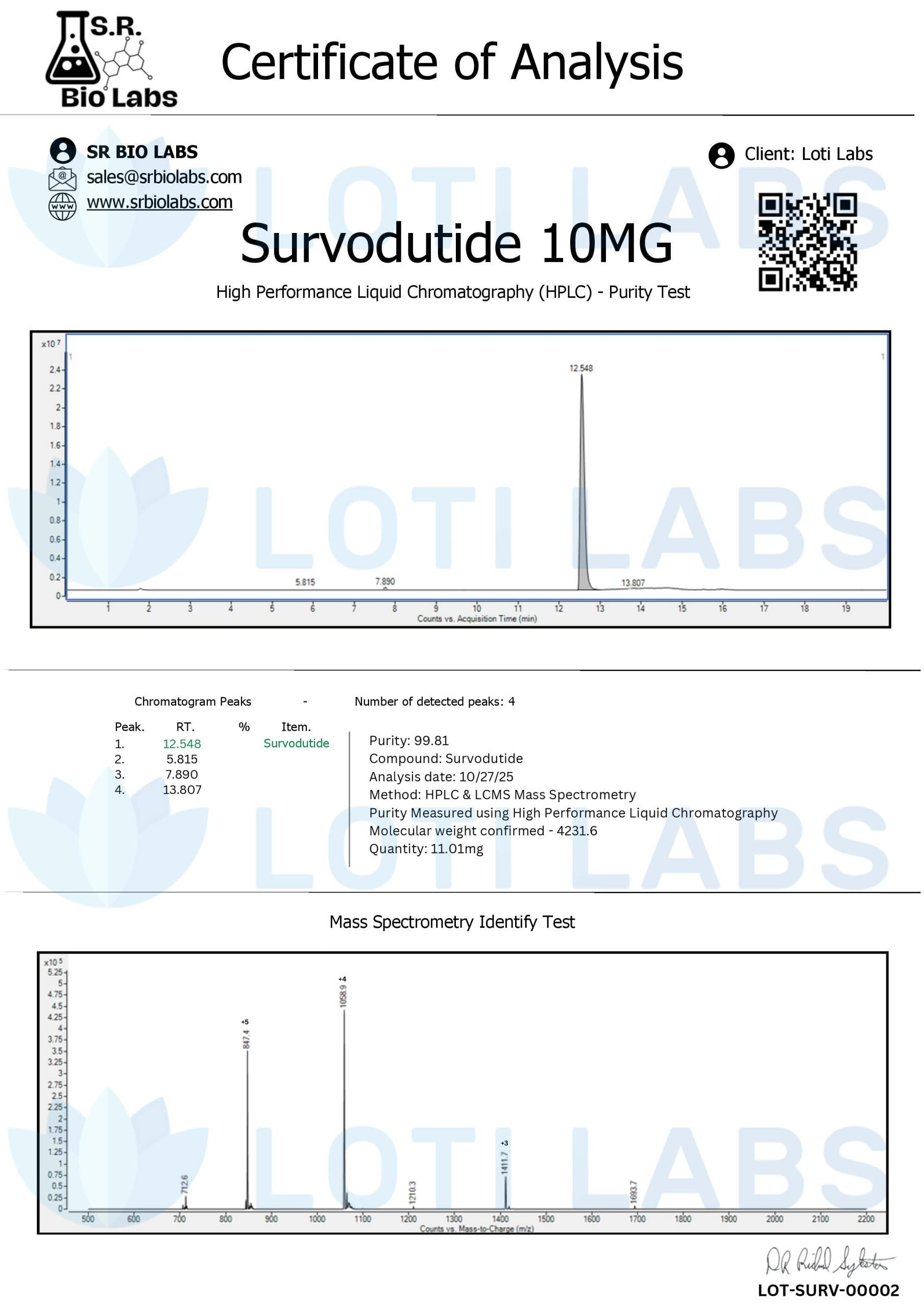 Every batch of products sold by Loti Labs is tested by third party using HPLC to ensure product purity and accuracy. We provide certificates of analysis for identity, purity and potency of survodutide and all other research compounds.