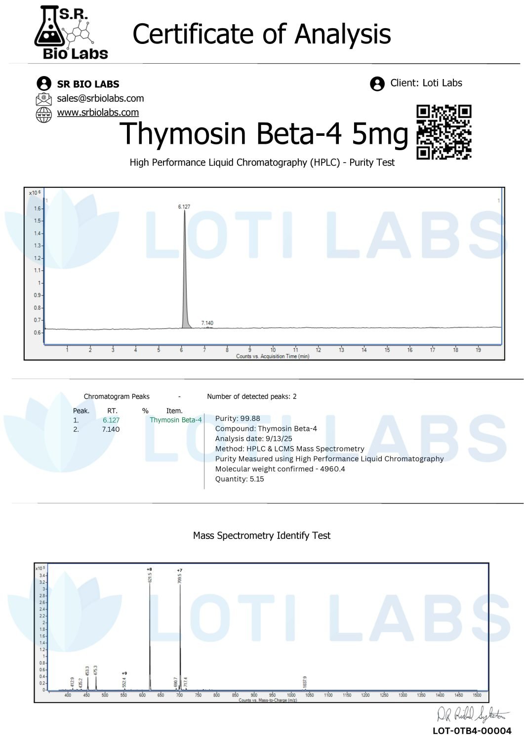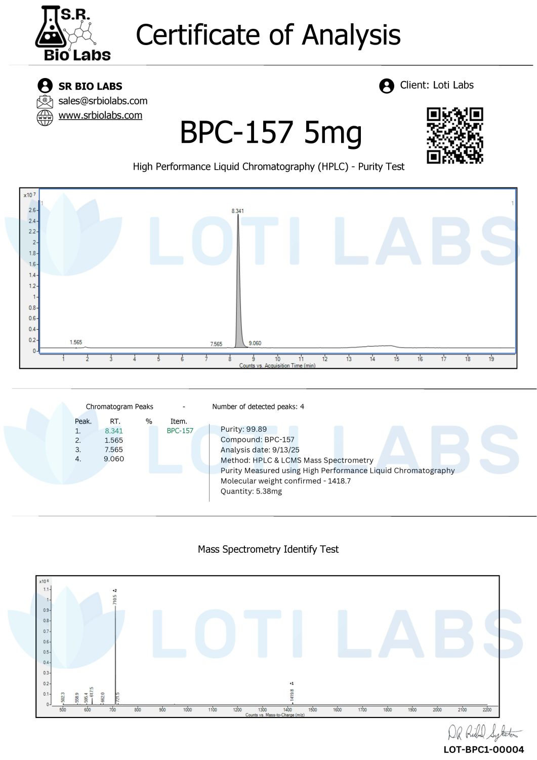 Certificate of analysis for BPC-157 5mg showing HPLC purity test graph, chromatogram data, and mass spectrometry identify test, branded with SR BIO LABS and LOTI LABS logos.
