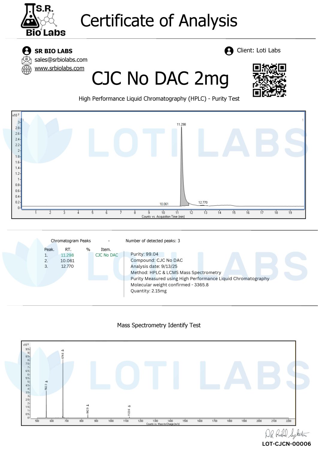 Certificate of analysis for CJC No DAC 2mg shows HPLC purity test with a single major peak at 99.04%, and mass spectrometry identify test graph with signal intensity.