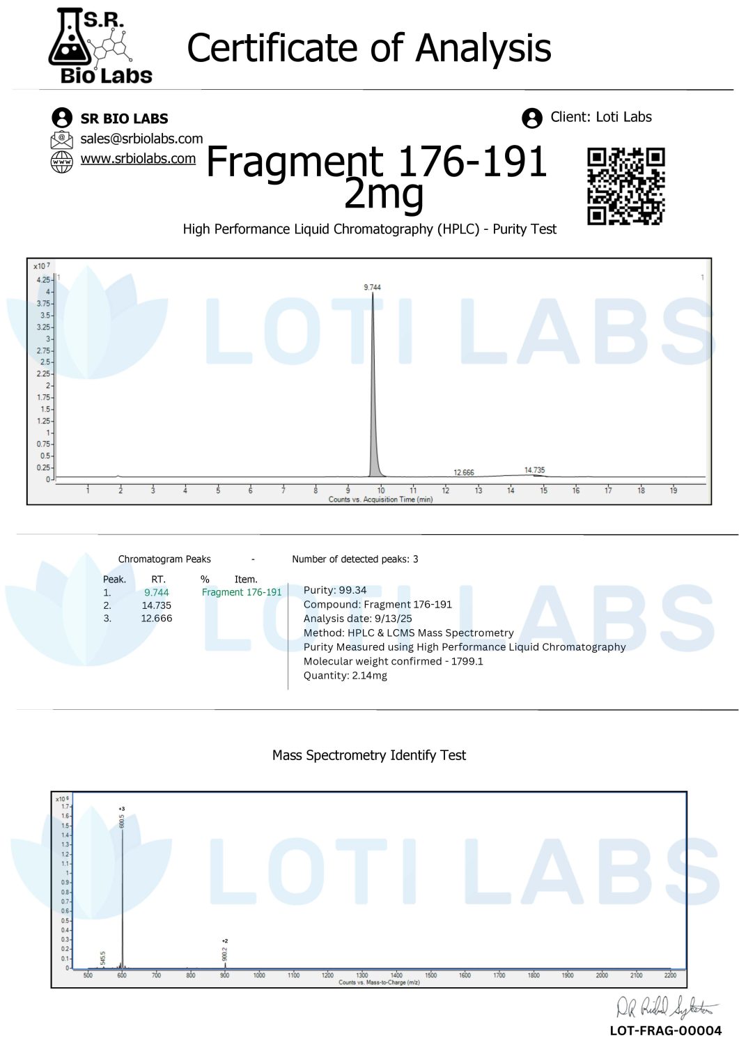 Certificate of Analysis for Fragment 176-191, 2mg; includes HPLC purity test graph, mass spectrometry identify test graph, compound data, and chromatogram peaks table.