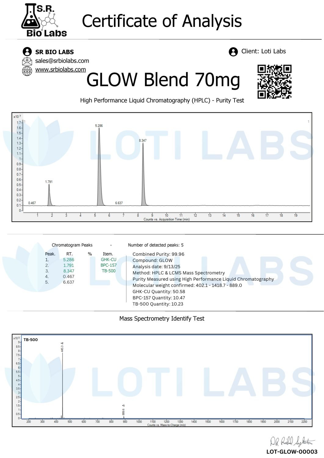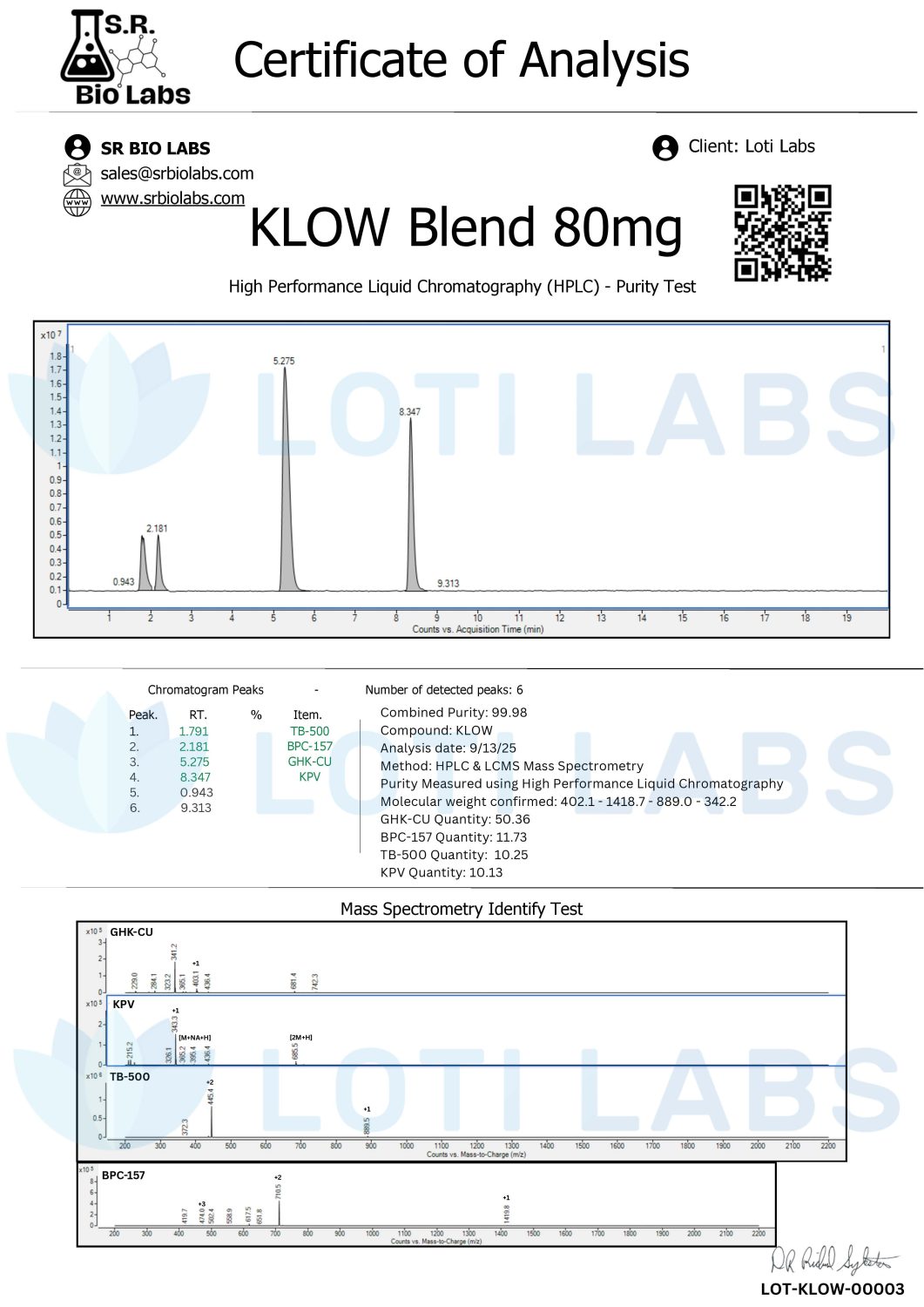 Certificate of analysis showing HPLC chromatogram and compound purity for KLOW Blend 80mg, tested by SR Bio Labs for Loti Labs, with test results and signatures.