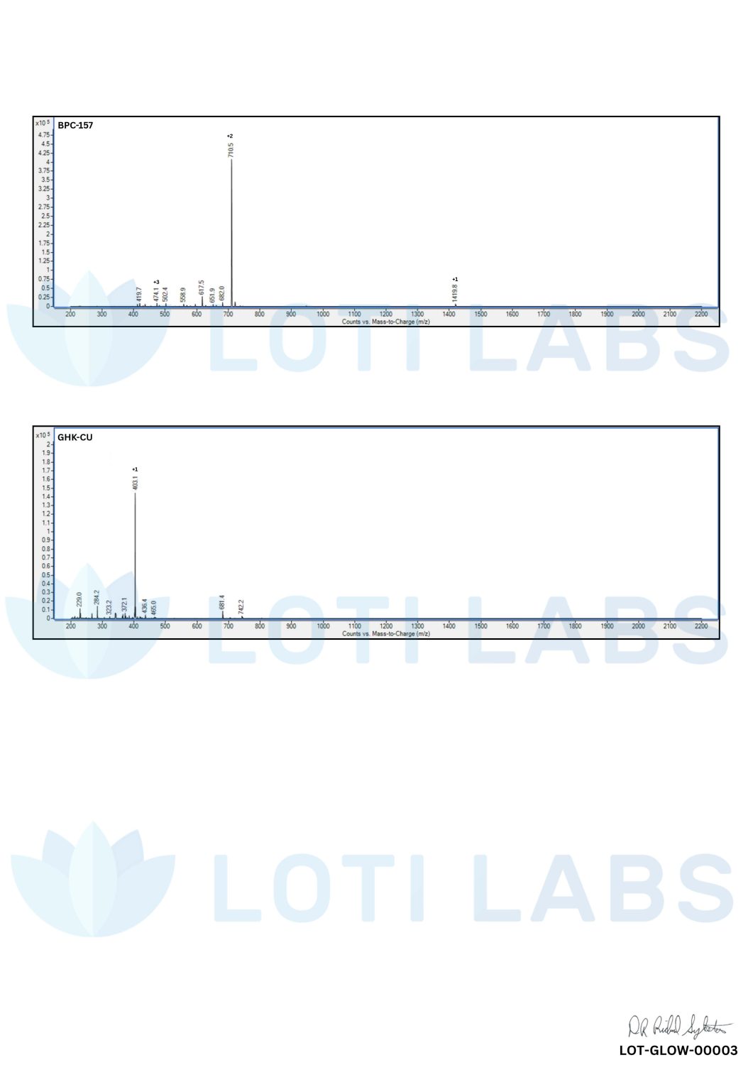 Two chromatograms from Loti Labs labeled BPC-157 and GHK-CU, each showing peaks along the x-axis with unit markers and the Loti Labs logo in the background.