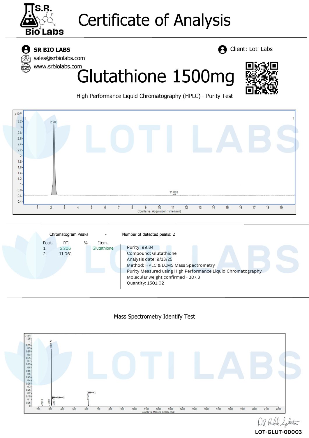 Certificate of analysis for Glutathione 1500mg showing HPLC purity test chromatogram with compound at 99.4% purity and mass spectrometry confirmation; issued by Loti Labs.