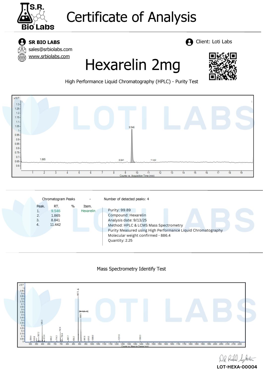 Certificate of Analysis for Hexarelin 2mg includes HPLC and mass spectrometry chromatograms, compound information, and laboratory branding for SR Bio Labs and Loti Labs.