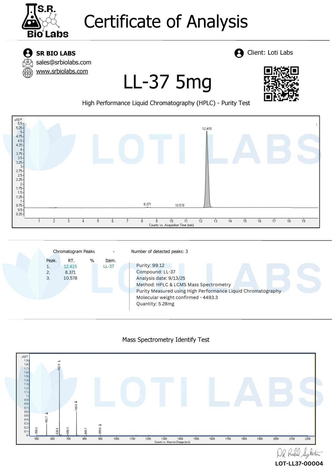 Certificate of Analysis for LL-37 5mg showing HPLC purity test graph, mass spectrometry results, and detailed chromatogram data for SR Bio Labs client Loti Labs.