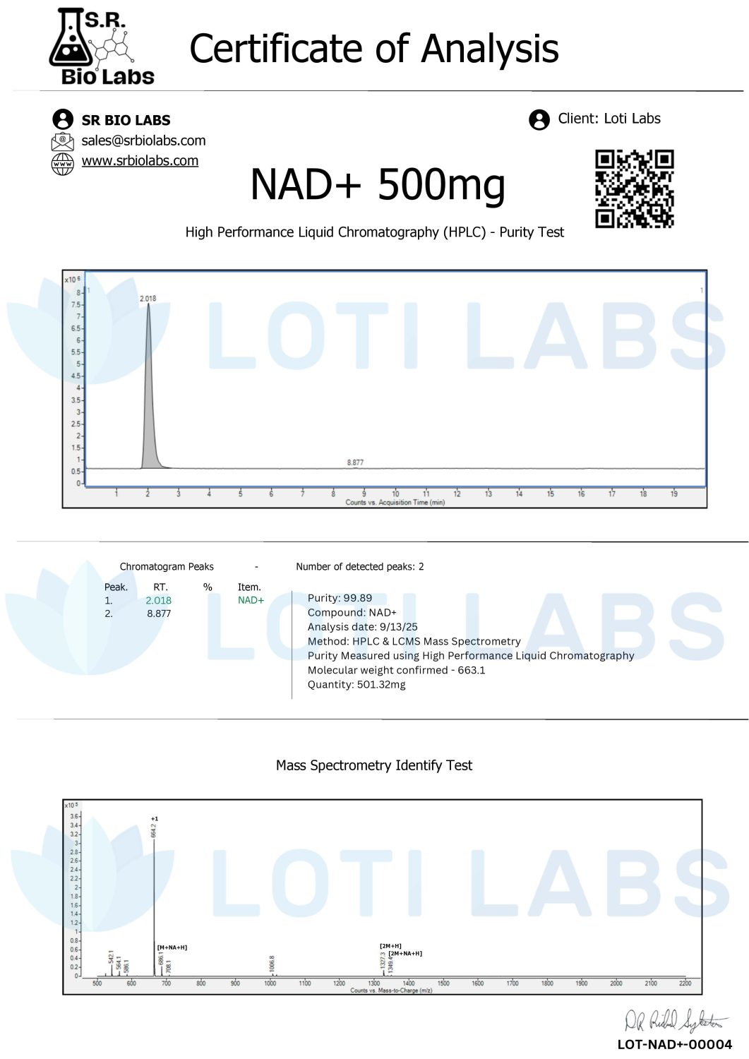 Certificate of Analysis for NAD+ 500mg showing HPLC chromatogram and mass spectrometry data, confirming compound identity and purity for Loti Labs.