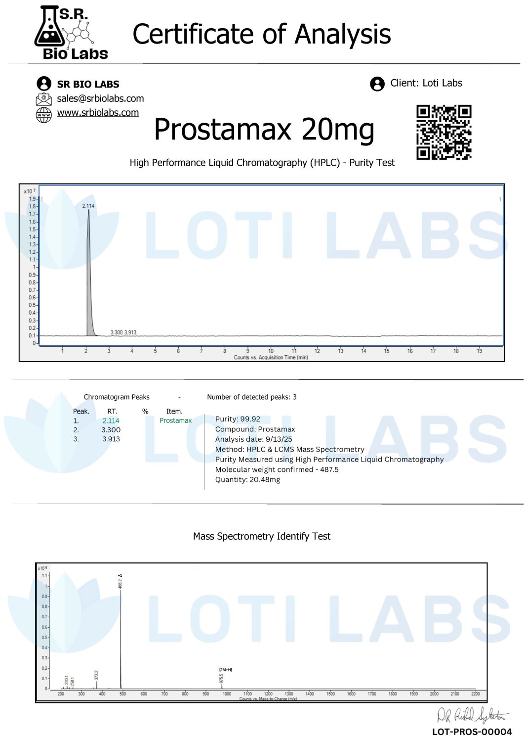 A certificate of analysis for Prostamax 20mg shows an HPLC purity test graph, chromatogram data, mass spectrometry results, and company contact information from Loti Labs.