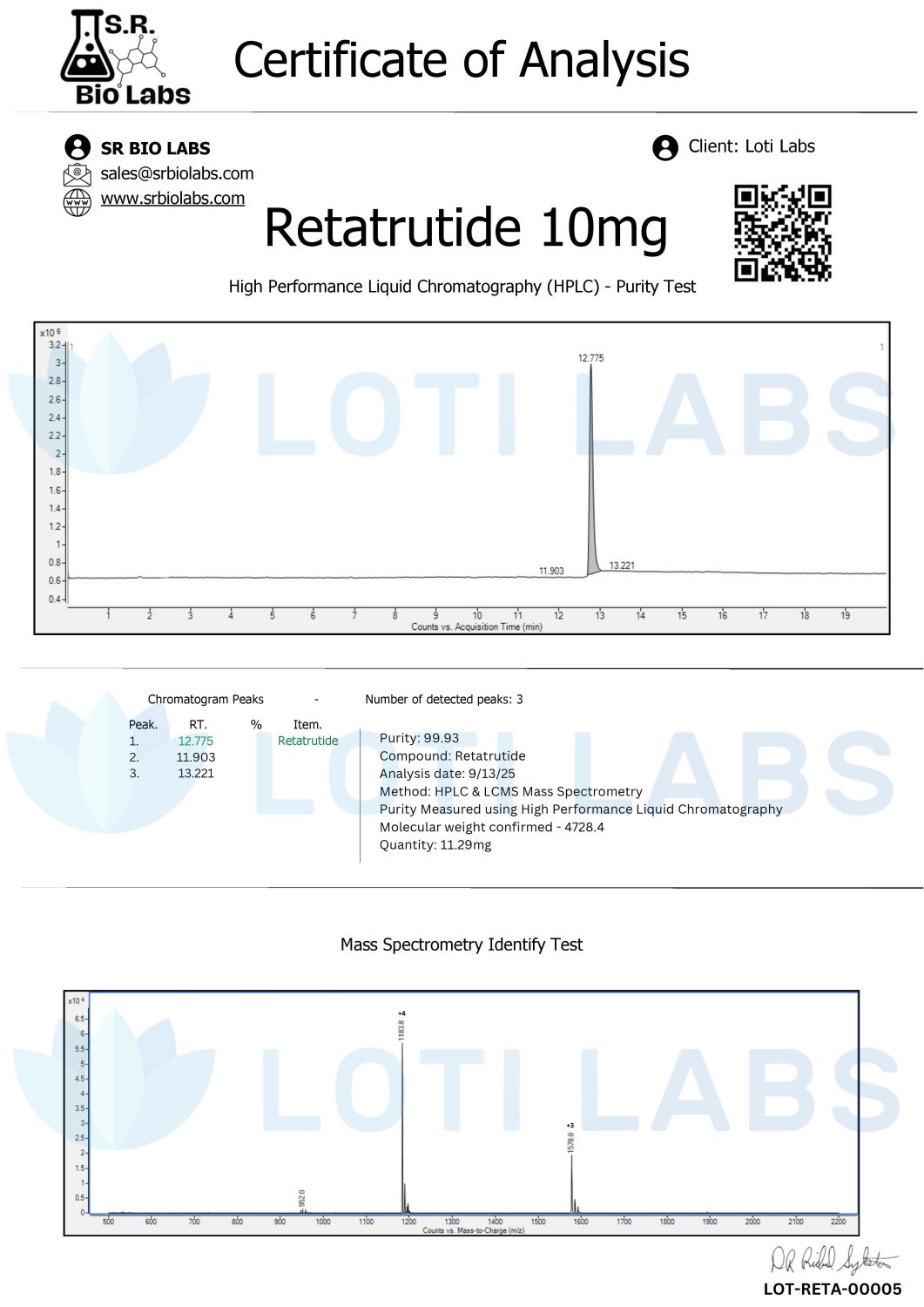 Certificate of Analysis for Retatrutide 20mg from Loti Labs showing HPLC purity test results and mass spectrometry identification data with graphs and details.