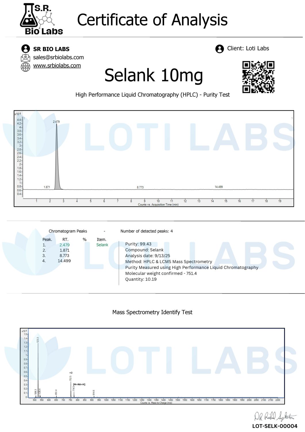 Certificate of analysis for Selank 10mg showing HPLC and mass spectrometry purity test results, chromatogram peaks, and compound details from Loti Labs and SR Bio Labs.