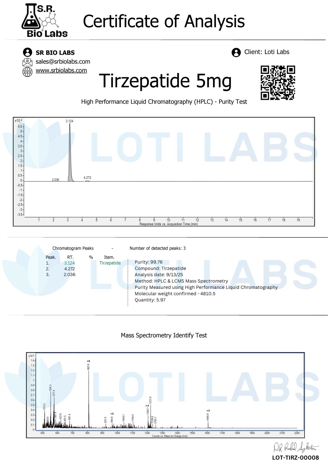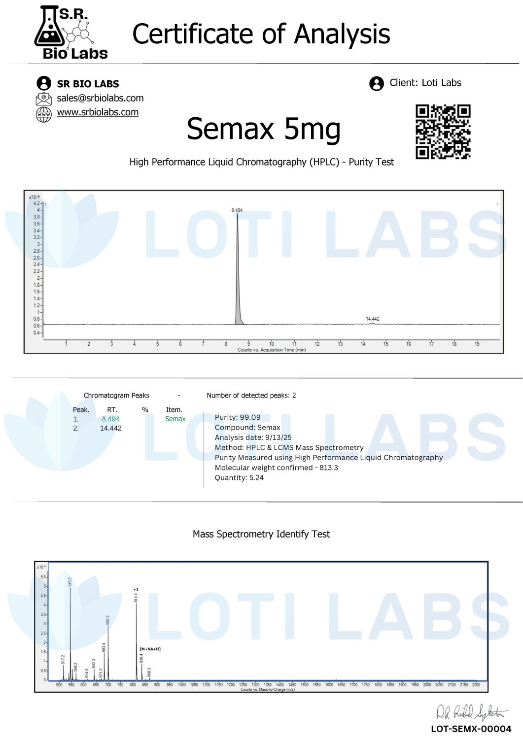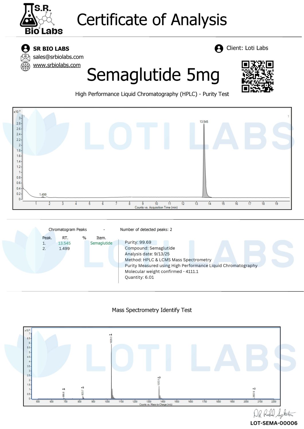 Certificate of analysis for Semaglutide 5mg showing HPLC purity test and mass spectrometry results, issued by Loti Labs under SR Bio Labs.